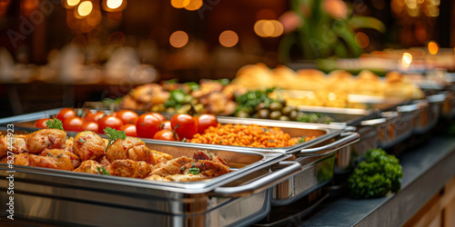 A long table with chafing dishes filled with delicious food, ready for an evening party. Group of people eating catering buffet food indoors at restaurant or wedding venue with colorful meat,vegetable