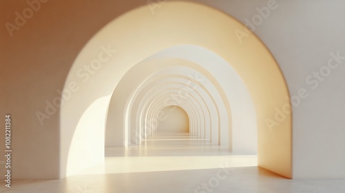 A long, white hallway with a series of arches leading to a warm, inviting light at the end.
