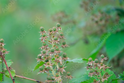 a lot of green unripe wild blackberries grow on branch of a blackberry bush in the forest, wild raw berry