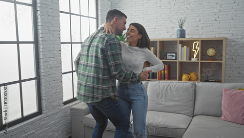 A loving hispanic couple embraces joyfully in their cozy living room, exuding happiness and togetherness.