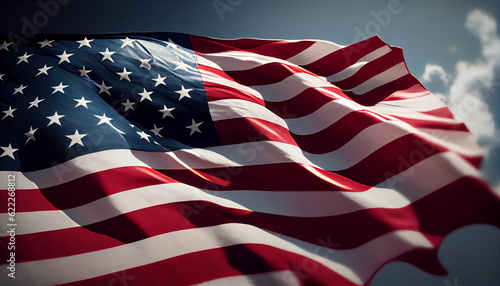 A low angle view of stars and stripes on american flag against blue sky Ai generated image