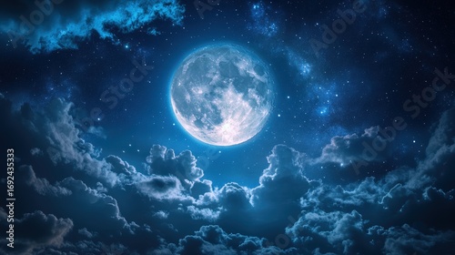 A luminous full moon illuminates a starry sky, surrounded by dramatic clouds, creating a serene nightscape filled with celestial beauty.