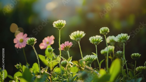 A lush garden with flowers of all colors, but at the very tips, green flowers begin to sprout, signaling the beginning of something magical.