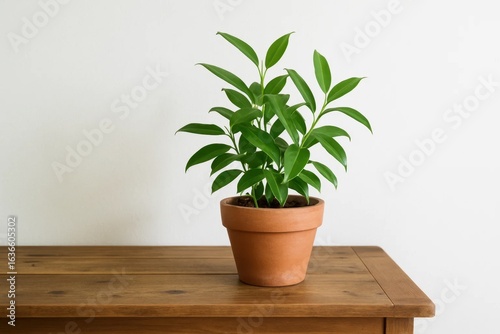 A lush green plant thrives in a rustic terracotta pot on a simple wooden table, set against a pristine white wall