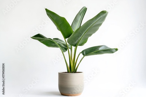 A lush green plant with large leaves and a sturdy stem, set against a white background.