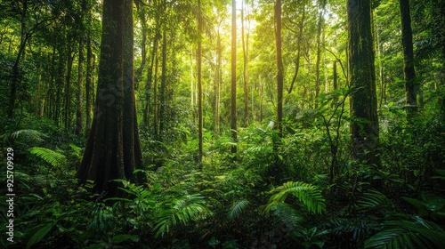 A lush rainforest scene with thick foliage and towering trees, providing a vibrant natural backdrop with plenty of copy space