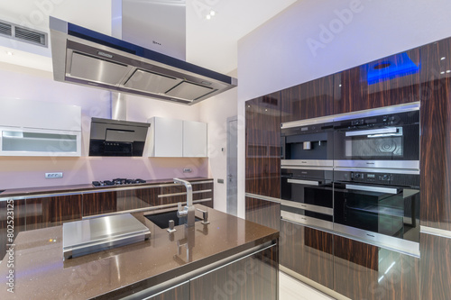 A luxurious bright kitchen with dark furniture, built-in appliances and a kitchen work desk .in the center.
