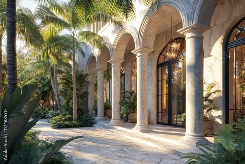 A luxurious Mediterranean exterior with soft arches, marble columns, and a lush palm-filled garden