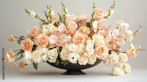 A luxurious pastel floral arrangement featuring pale peach orchids and cream-colored roses