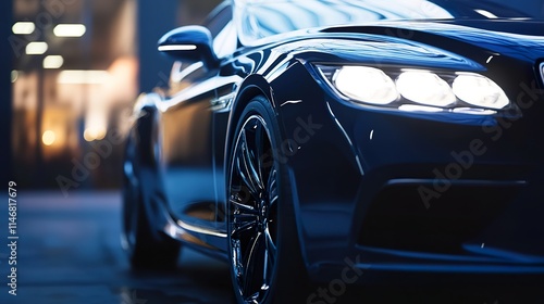 A luxury car with a glossy navy blue finish, parked under soft lighting