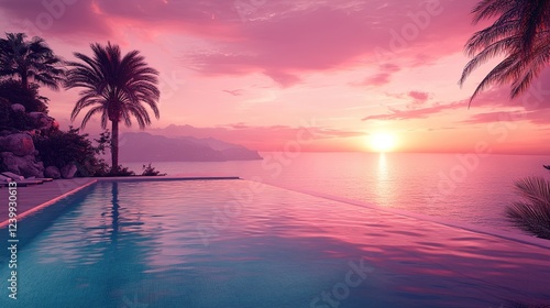 A luxury infinity pool overlooking a tropical beach at sunset, serene and indulgent