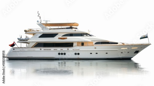 A luxury yacht with a sun deck, isolated on white background