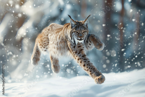 A lynx pounces on its prey in a snowy forest, mid-air with paws extended