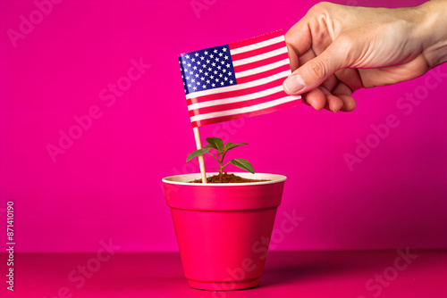 A macro shot of a small American flag into a flower pot, symbolizing patriotism and growth