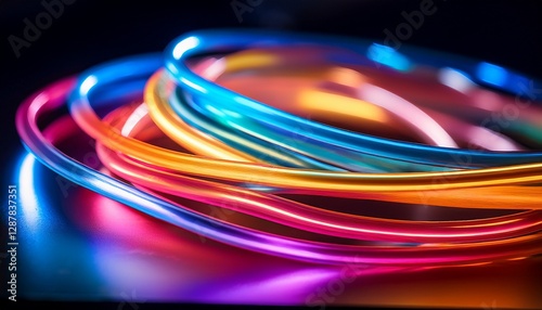 A macro shot of neon light tubing, highlighting vibrant colors and glowing edges, capturing the intense glow and intricate details of the light source.