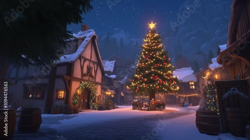 A magical snowy village square illuminated by twinkling Christmas lights, with a decorated tree at the center.