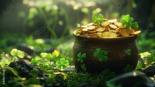 A magical St. Patrick's Day scene featuring a green pot overflowing with gold coins, set against a sunlit, blurred forest background with sparkling bokeh lights and scattered shamrock leaves.