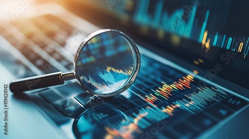 A magnifying glass placed on a laptop, exploring financial and business investment information.