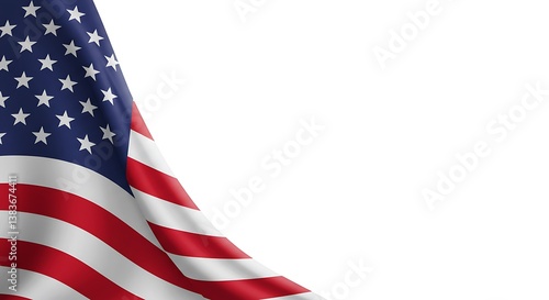 A majestic American flag gracefully unfolds, symbolizing patriotism and national pride, with vibrant colors against a crisp white backdrop.