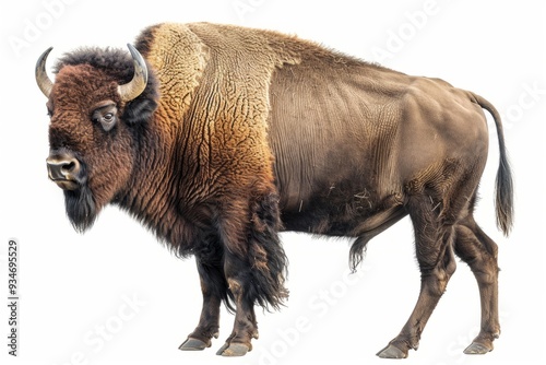 A majestic bison stands proudly on a white background. This powerful animal symbolizes strength and resilience in nature. Perfect for educational or wildlife-themed projects. Generative AI