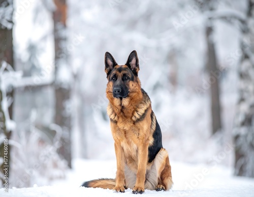 A majestic German Shepherd sits elegantly in a snow-covered forest