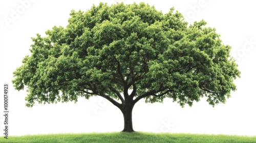 A majestic green tree dominates the landscape, surrounded by vibrant grass, showcasing nature's beauty on a sunny summer day, inviting tranquility and peace