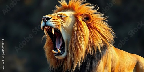 A majestic lion roars, mane flowing, muscles tense, showcasing raw power, fear, wilderness