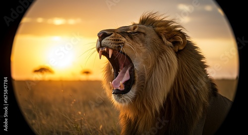 A majestic lion roars, mouth agape, against a breathtaking golden sunrise over the African savanna.