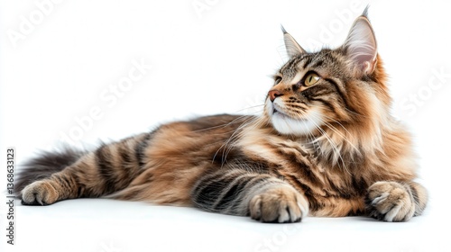 A majestic Maine Coon cat resting gracefully on a white background.