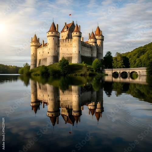 A majestic medieval castle with multiple turrets reflected perfectly in a serene lake under a partly cloudy sky with warm sunlight.