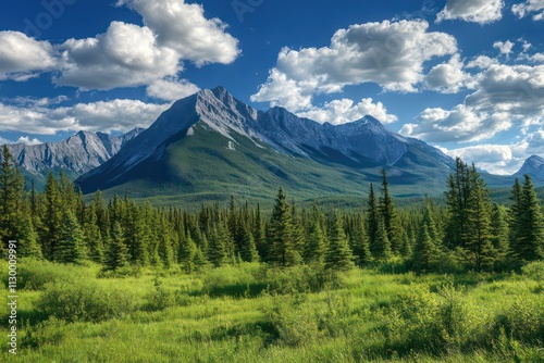 majestic, mountain, range, lush, green, forest, covering, foothill, under, clear, blue, soft, white, cloud, drifting