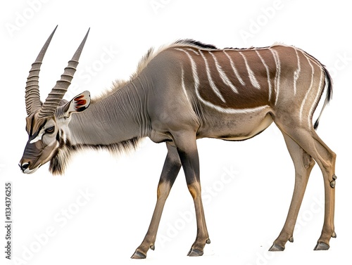 A majestic nyala antelope stands gracefully on a white background showcasing its unique striped coat and impressive horns.