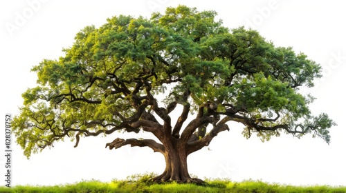 A majestic oak tree with sprawling branches and lush green leaves, standing alone with no background