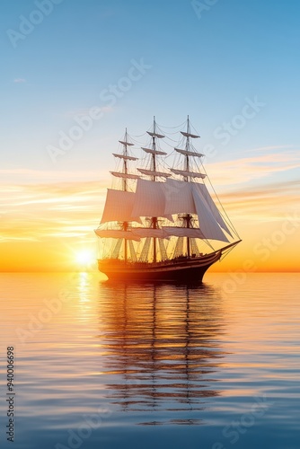 A majestic sailing ship gracefully gliding on calm waters during a stunning sunset, capturing the beauty of ocean adventure.