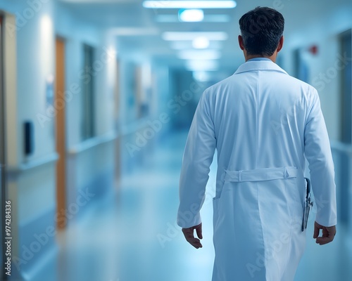 A male doctor in a white coat walking down a hospital corridor,