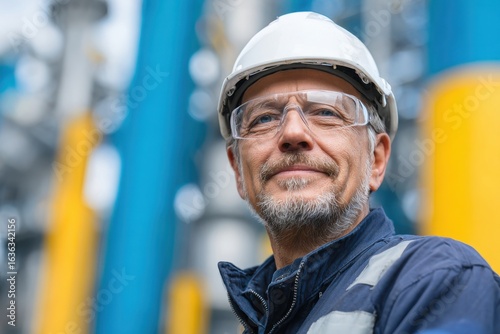 A male industrial engineer wearing a white helmet and safety glasses stands in front of an oil production plant.