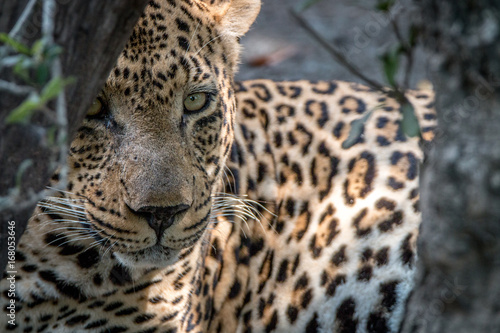A male Leopard starring at the camera.