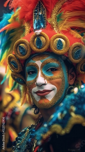 A male performer with intricate face paint and vibrant feathered headdress during a lively cultural festival.