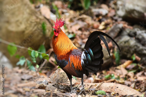 A male Red Junglefowl with beautiful sheen feathers foraging for food on the ground at Kaeng Krachan Thailand