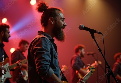 singer, band, music, concert, performance, stage, lighting, red, blue, microphone, guitar, musician, vocalist, bearded, man, male, group, live, show, entertainment, rock, pop, indie, instrument, spotlight, passion, energy, crowd, audience, atmosphere, feeling, emotion, expression, sound, volume, melody, harmony, rythm, song, lyric