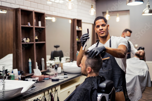 A man client visiting haidresser and hairstylist in barber shop.