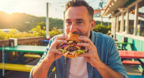 burger, eating, beard, man, patio, scenic, background