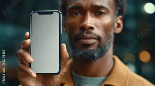 A man holding a smartphone with a blank screen, suggesting technology and communication