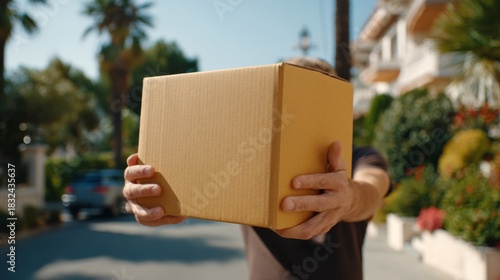 A man holds a cardboard package confidently in front of him, surrounded by a sunny neighborhood atmosphere.