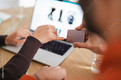 shopping, credit card, e-business, teamwork, laptop, online, buying, payment, browsing, hand, digital, purchase, technology, couple, man, woman, casual attire, lifestyle, desk, workspace, decision, cyberspace, closeup, computer, remote, business, office, financial, transaction, modern, card, spending, study, creative, cooperation, friends, comfortable, retail