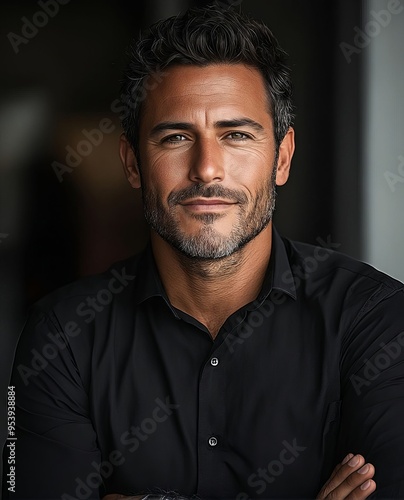man, black, shirt, arm, crossed, arm, cross, portrait, pose, smile, serious, expression, face, wearing, beard, moustache, short, dark, hair, looking, camera, slimmer, front, resting, chin, hand, background, blurred, indoor, setting, window, plant, visible, lighting, soft, natural, creating, moody, atmosphere, mood, professional, relaxed