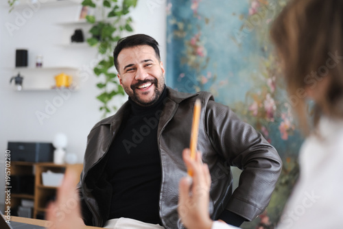 A man in a leather jacket laughs during a meeting with a colleague, who holds a pencil in the foreground.