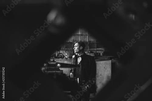 A man in a suit and coat poses for advertising men's clothing. Black and white photo. Advertising menswear