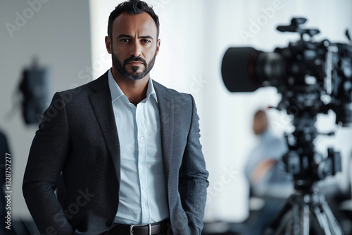 a man in a suit and tie standing in front of a camera and a light set up for a photo shoot