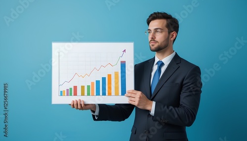 man, suit, attaching, goggles, computer-screen, graph, chart, blue background, business, technology, stock exchange, investment, professional, corporate, office, workplace, career, success, achievement, businessman, touch, hand, future, finger, network, cyberspace, graph, chart, growth, diagram, financial, presentation, finance, people, person, market, stock, concept, money, economy, arrow, up, profit
